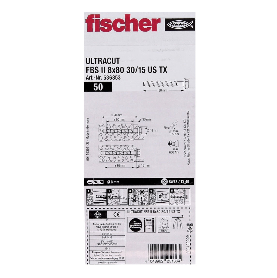 Fischer ULTRACUT FBS II Betonschraube 8x80mm 30/15 100 Stk. Sechskantkopf SW13 U-Scheibe TX40 galvanisch verzinkt ( 536853 )
