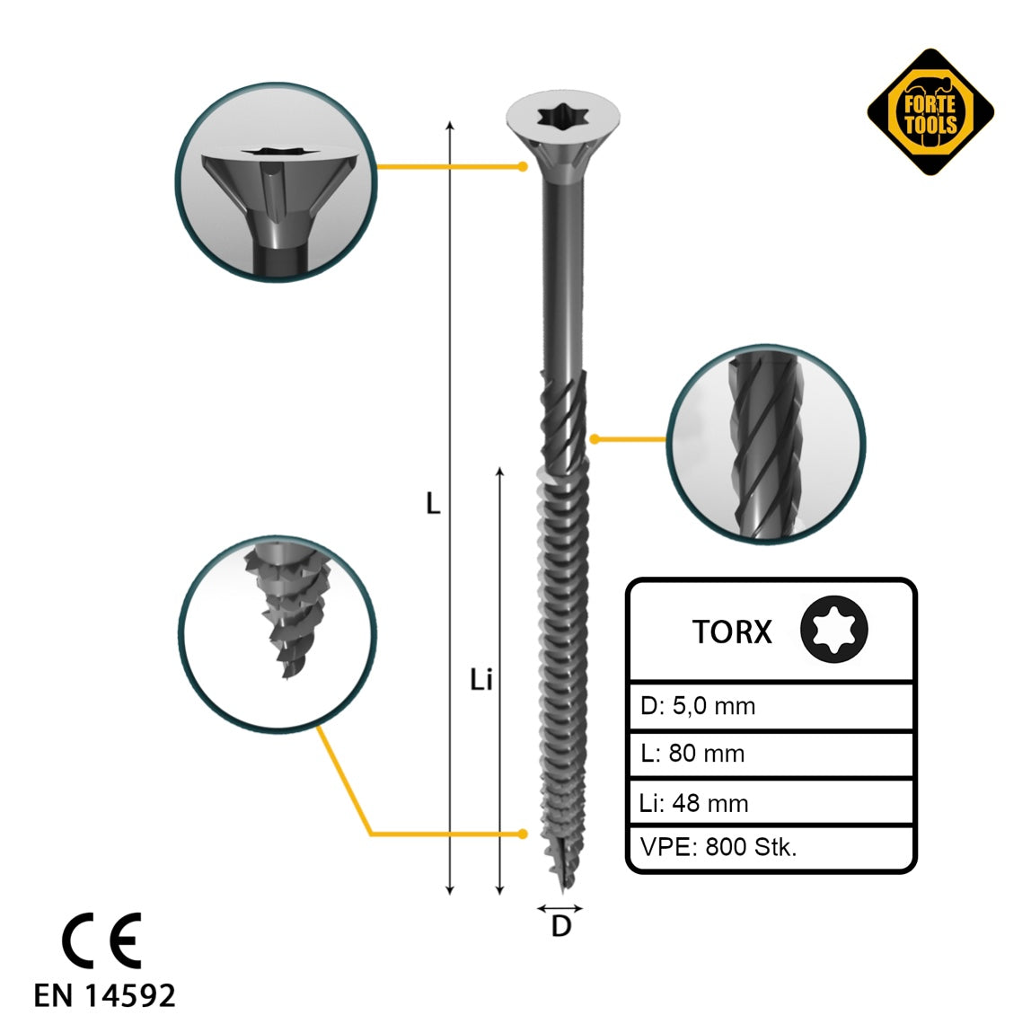 FORTE Tools Universal Holzschraube 5,0 x 80 mm T25 800 Stk. ( 4x 000040113884 ) silber verzinkt Torx Senkkopf Teilgewinde