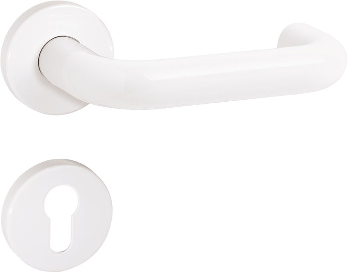 in R technology with roses to DIN 18255 and DIN EN 1906 made of polyamide, high-gloss surface, consisting of: U-shaped lever handle made of polyamide with continuous steel core right through to the lever handle end, coloured throughout, diameter 23 mm, with lug guide and latching groove, installation by simply snapping the lever handle into the bottom parts pre-mounted on the door. The latching mechanism can be released again using a disassembly spanner. The lever handle fulfils the requirements of DIN EN 179 and DIN 18040. Rose substructure in plastic/stainless steel composite construction, can be used DIN left and DIN right. Fixed pivot bearing of the lever handle with automatically engaging all-round locking and 5 mm bearing point as maintenance-free plain bearing with elastic compensation area and second bearing point in the lever handle neck. Concealed, anti-loosening screw fitting with M4 screw and sleeve screw combination and support pin. Rose cover cap, round, made of polyamide, coloured throughout, diameter 55 mm, 13 mm high, curved, 1.5 mm wall thickness. Perforation PZ Designed and tested for the contract sector, user category in accordance with DIN EN 1906 - Class 4 Fire protection set with square spindle 9 mm, in accordance with DIN 18273 - Lever handle set - Lever handle length 150 mm