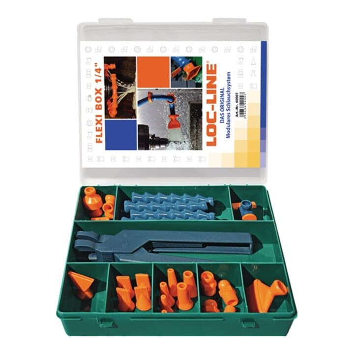 Loc-Line - 6.35 mm (1/4 inch) - Set and basic equipment for the most common applications - Art.No. 4000 879 841 consisting of: 8 pieces articulated hoses, 90 mm each 2 pieces round nozzles 1.5 mm Ø 2 pieces round nozzles 3 mm Ø 2 pieces round nozzles 6 mm Ø 1 piece wide jet nozzle 25 mm 1 piece flat nozzle 12x1 mm 1 piece flat nozzle 12x1.5 mm 1 piece 5-hole nozzle 1,5 mm Ø 1 piece 7-hole nozzle 1 mm Ø 1 piece articulated shower nozzle 16x1 mm Ø 1 piece clamping ring with screw 1 piece Y-branch 2 pieces threaded nipple NPT R 3.18 mm (1/8") 2 pieces threaded nipple NPT R 6.35 mm (1/4") 1 piece shut-off valve with articulated connection 1 piece non-return valve 1 piece assembly pliers