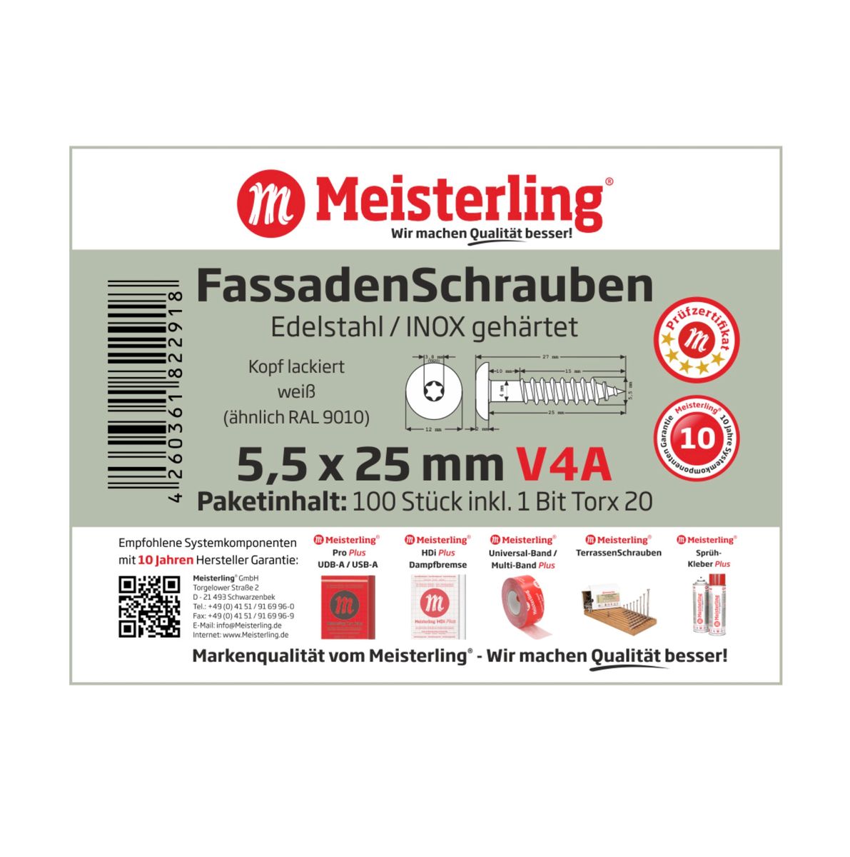 Meisterling Fassadenschrauben 5,5x25 mm 100 Stück ( 010030000001 ) 12 mm Flachkopf weiß mit Torx Teilgewinde V4A Edelstahl
