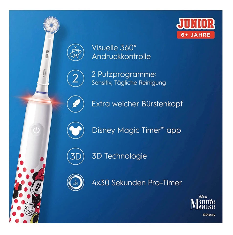 - 1x Oral-B Junior Minnie Mouse Electric Toothbrush/Electric Toothbrush, children from 6 years, 2 brush attachments, 360° pressure control, 2 brushing modes incl. sensitive dental care, soft bristles, timer, white