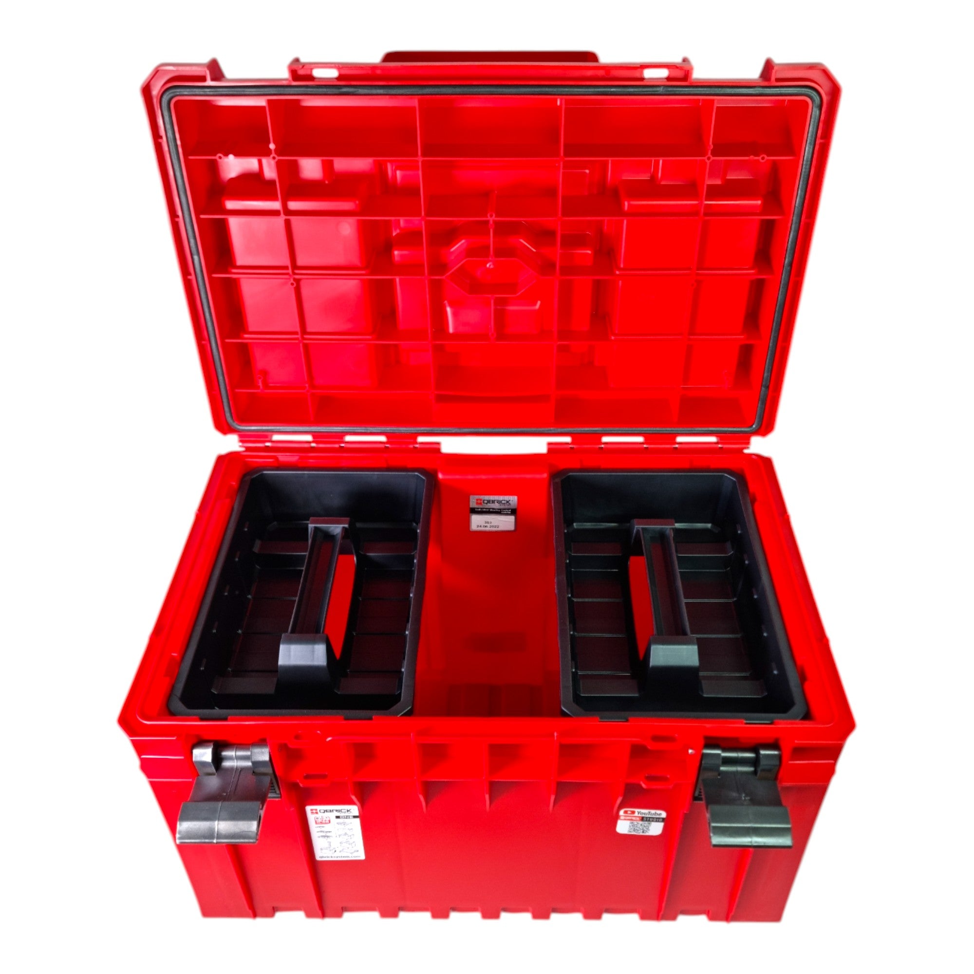 RED ULTRA HD is a special edition of Qbrick System ONE products made of ultra-resistant plastic, which is characterised by exceptional resistance to mechanical damage. The impact tests carried out confirm its exceptional durability, even in conditions below 0 °C. The ONE 450 is a toolbox with a very large capacity of 52 litres. This enables it to hold large power tools and hand tools. For better internal organisation, the box is equipped with two shelves and two compartments (including the multi-compartment with holders for hand tools). Each box is equipped with a flexible seal that provides full protection against the ingress of dust and water (IP66). Version 2.0 of the ONE product line is a new generation of toolboxes and organisers with a reinforced design. By additionally adapting the housings to M8 threaded inserts, the system can be customised to the user's needs. The custom version of this box model is equipped with ten M8 threaded inserts that allow customisation by the user. The professional version includes lids equipped with two spacious organisers with movable dividers and impact-resistant polycarbonate films.