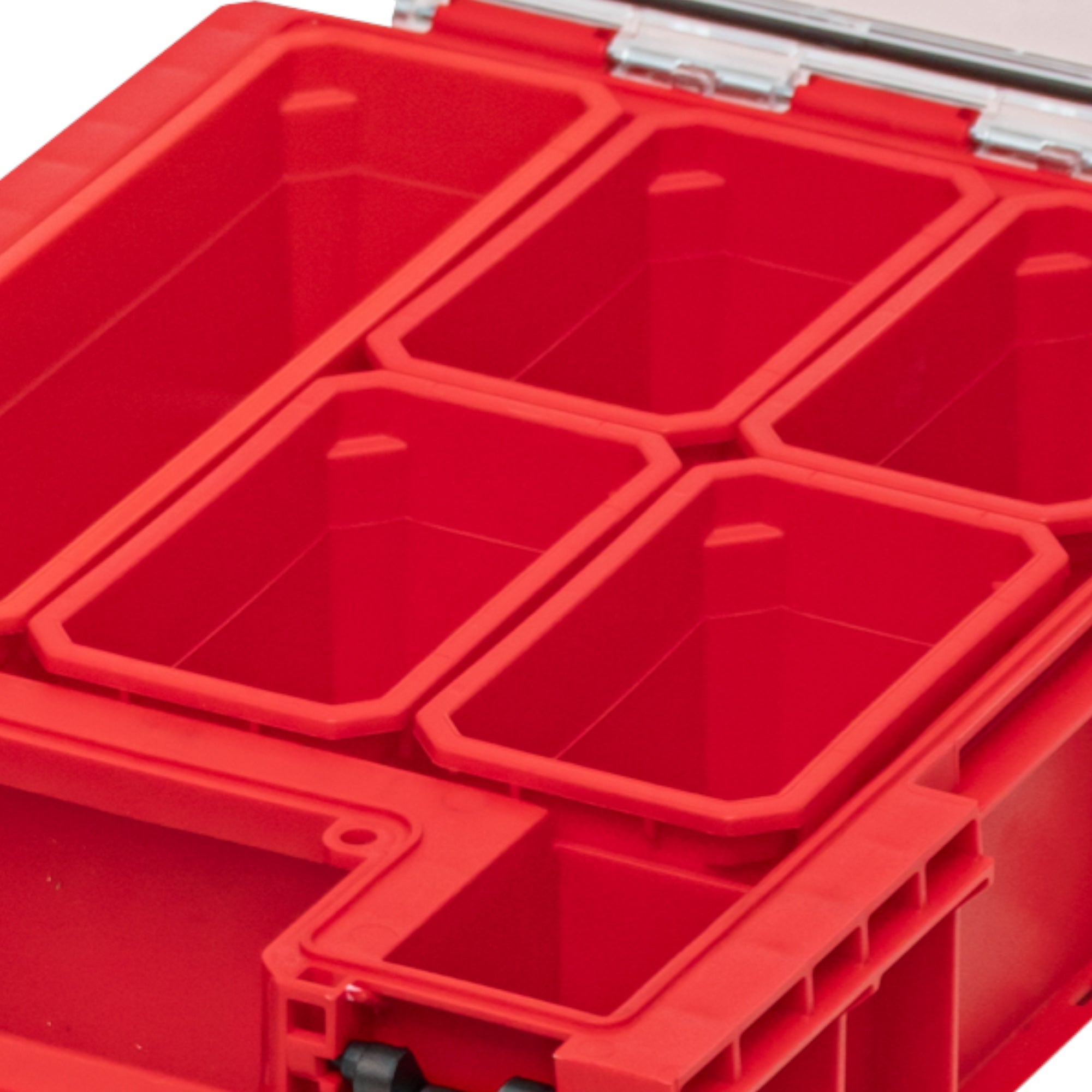 RED ULTRA HD is a special edition of Qbrick System ONE products made of ultra-resistant plastic, which is characterised by exceptional resistance to mechanical damage. The impact tests carried out confirm its exceptional durability, even in conditions below 0 °C. Qbrick System ONE Organizer M Plus is a higher model of the M organiser from the ONE modular organiser range, which can be combined in many configurations. The Organizer M Plus features the patented Easy Access System, which, thanks to special connecting elements, allows easy access to each module without having to detach it, significantly increasing work ergonomics. As standard, the Organiser M Plus is equipped with 5 buckets for accessories, including 4 smaller and one long bucket for storing and transporting the longitudinal elements of your workshop. In addition, the contents of the organiser are protected against the ingress of water and dust by a flexible seal fitted in the polycarbonate cover. A special organiser lid lock prevents uncontrolled dropping.