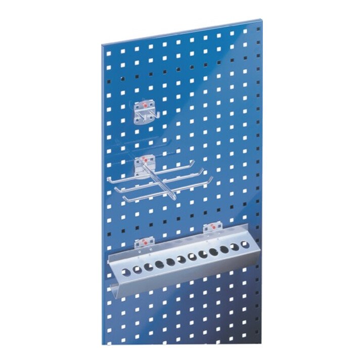 Flexible and expandable - ideal for mounting on walls, workbenches or for use as free-standing partition walls - perforated panels made of 1.25 mm thick sheet steel - powder-coated - bevelled all round and reinforced with beams - hole spacing 38 mm - hole size 10 mm²