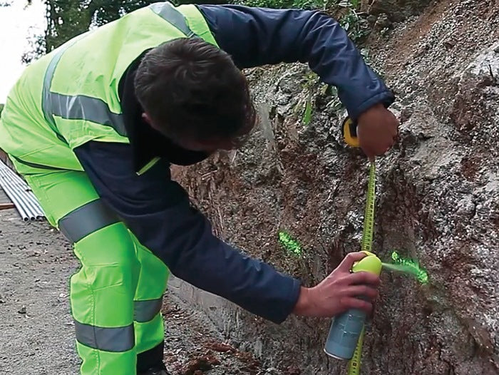 All-round marking spray with 360° spray nozzle, can be used in all positions - fluorescent colours - excellent luminosity and coverage - for markings on the construction site, for drilling, sounding, surveying work, electricity, gas and water work - temporary markings visible for up to 12 months - extremely good adhesion on all surfaces - even wet ones - fine and precise spray enables lettering and drawings - can also be used in sub-zero temperatures