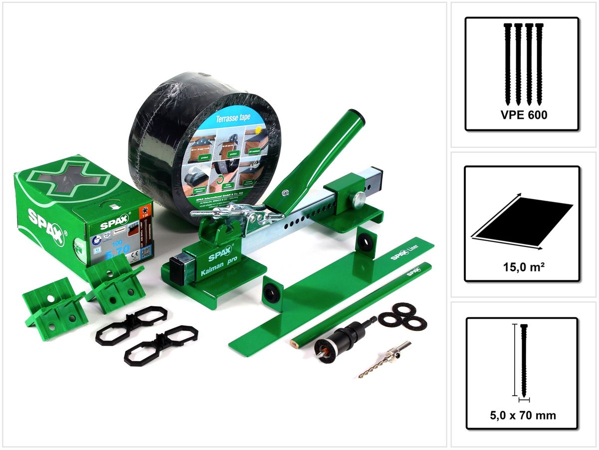 SPAX Komplett Set für 15m² Holz Terrasse - mit 600 Schrauben, Kaiman Pro und 317-tlg System Zubehör