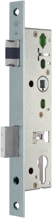 Passage function D for single-leaf framed doors - APD version (after opening from the inside, the door remains accessible in both directions until it is locked again) - Lock case made of steel, closed at the top and bottom - Continuous fitting hole above the lock follower - Chip protection sleeves - Single throw with sturdy deadbolt - Bolt throw 21 mm - DIN left and right inwards/outwards - Prepared for profile cylinder, with change - faceplate length 245 mm - 9 mm split follower - latch with silencer - nickel-plated deadbolt - stainless steel faceplate on centre - faceplate length 245 mm - canted - backset 15 mm - classification key to EN 12 209 available - tested and certified to EN 1125 and EN 179 in accordance with the certificate of conformity. certificate of conformity