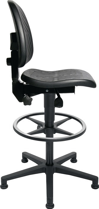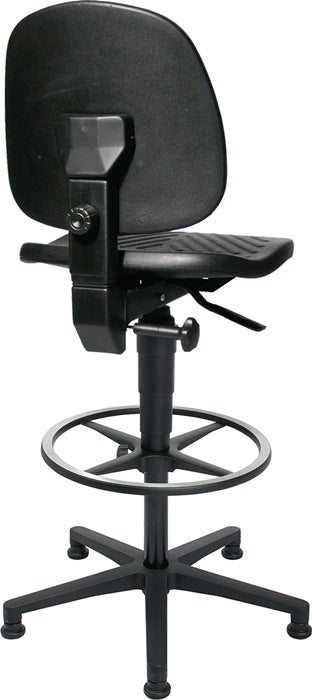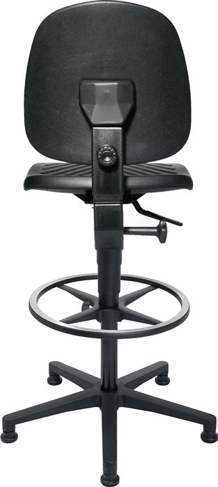 Seat and backrest made of robust, black polyurethane foam - Backrest adjustable in height and inclination - Backrest with permanent contact mechanism - Sturdy black polyamide base - With floor glides and height-adjustable foot ring - Base optionally with: - load-dependent braked double safety castors for hard floors - abrasion-resistant plastic floor glides and height-adjustable aluminium foot ring