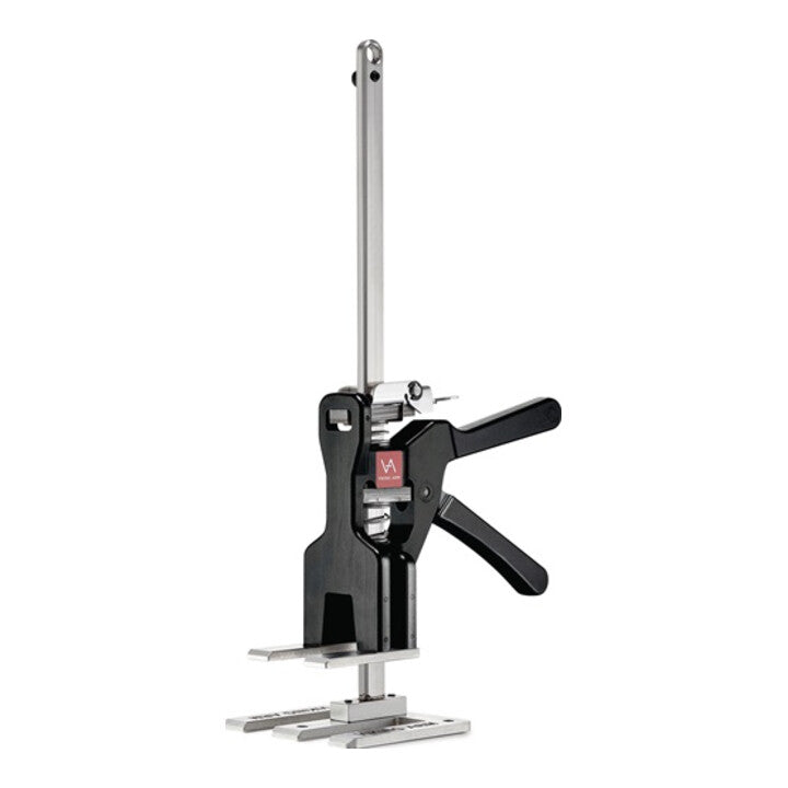 One-handed tool for controlled lifting and lowering when installing doors and windows etc., as well as for spreading and tensioning when laying laminate and floorboards Load limit 150 kg
