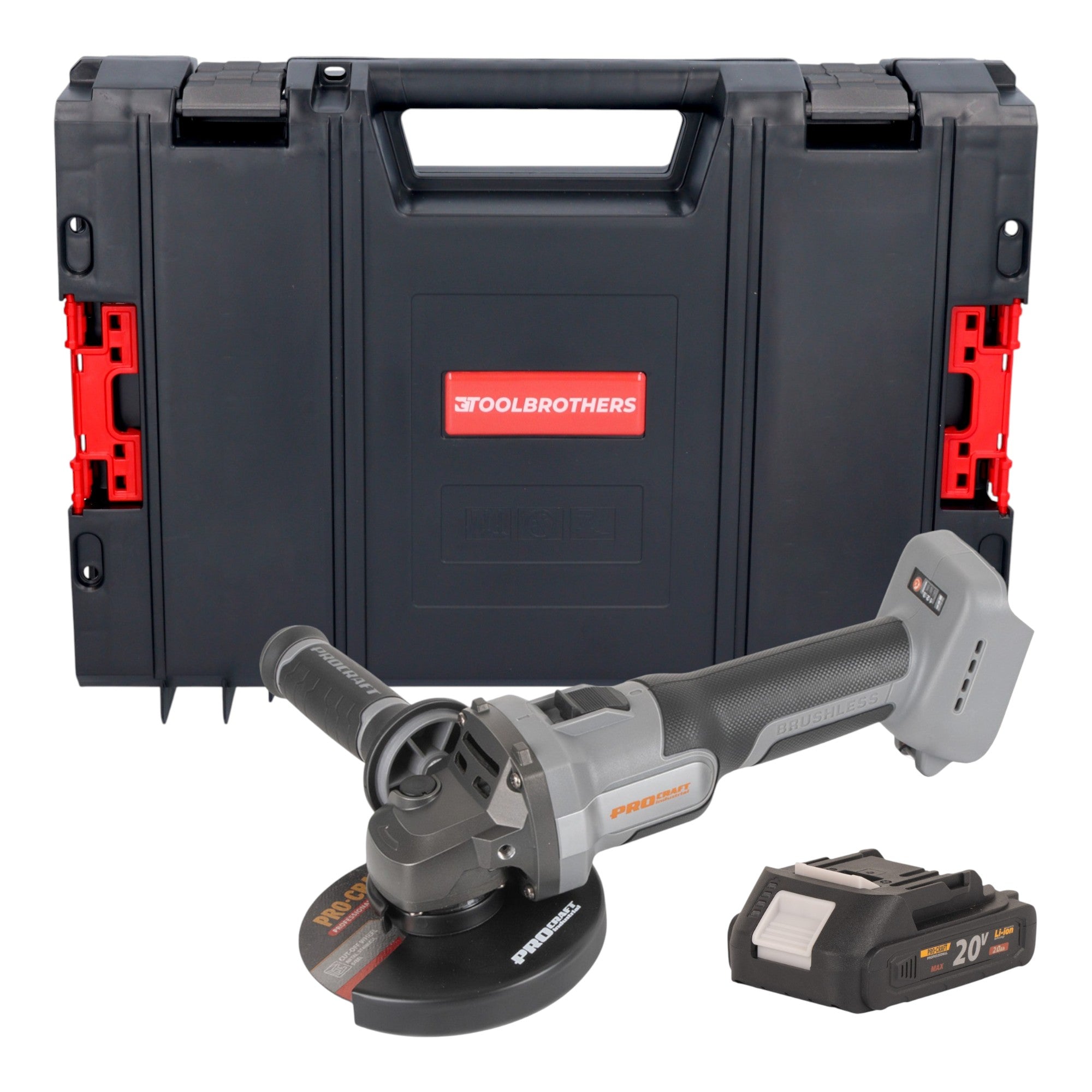 Amoladora angular a batería Procraft Industrial AG125Abb 20 V 125 mm sin escobillas + 1 batería de 2,0 Ah + maletín RHINO Toolcase - sin cargador