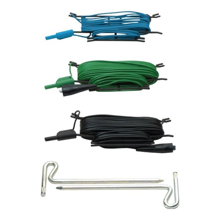 Juego de puesta a tierra para mediciones de puesta a tierra utilizando el método de medición de tres hilos, compuesto por 2 picas de tierra y 3 cables de prueba.