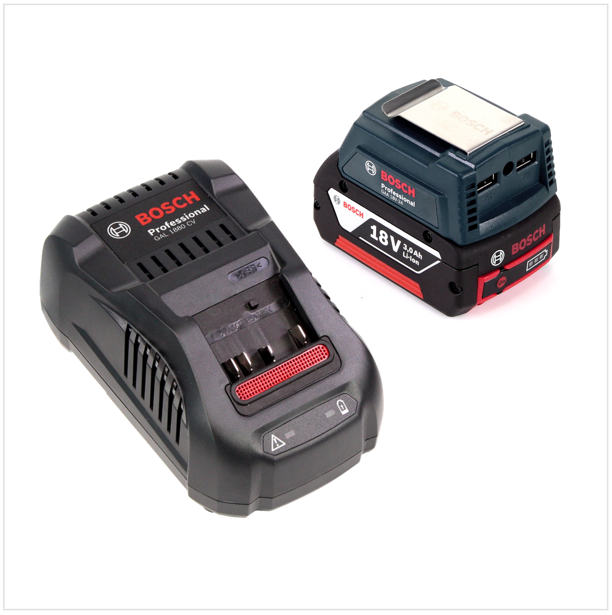 Bosch USB Power Set 18V con GAA Professional Adaptador Cargador USB para baterías de 14,4 / 18V + 1x Batería GBA 18V / 3,0 Ah + Cargador GAL 1880 CV