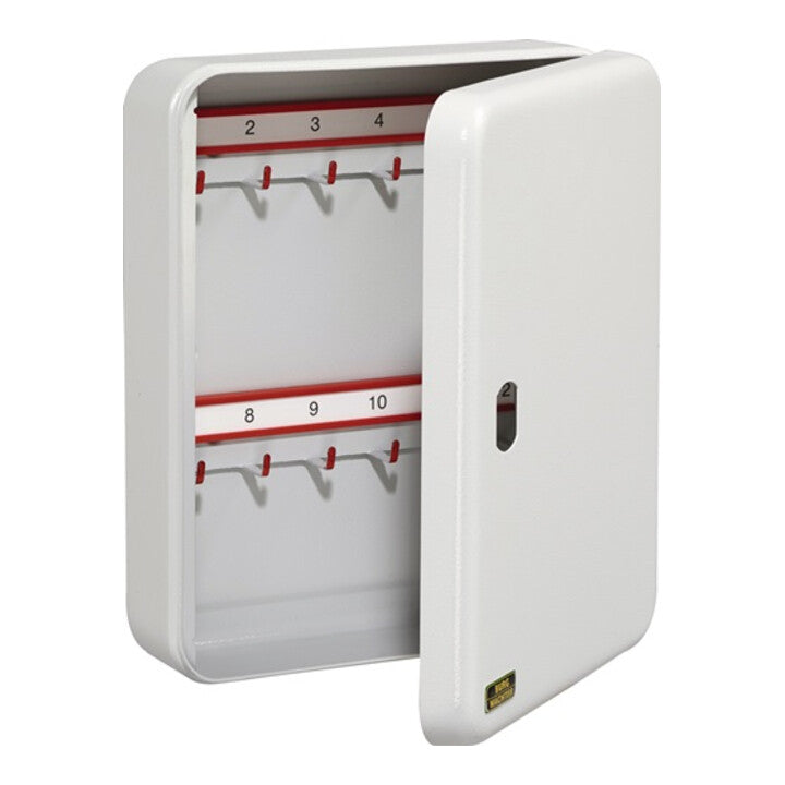 CityLine - caja de llave maciza - con cilindro de pivote de latón - tiras de gancho numeradas consecutivamente - cabezas de gancho aseguradas con tapas de plástico rojas - tiras de papel neutro en la parte posterior para el etiquetado individual - gris claro (RAL 7035) - distancia entre ganchos: 30 mm - versión V-PZ - preparada para semicilindros de perfil - sin cilindro - integrable en sistemas de cierre - importante: la orejeta de cierre debe poder cerrarse a 90° a la izquierda - distancia entre ganchos: 30 mm