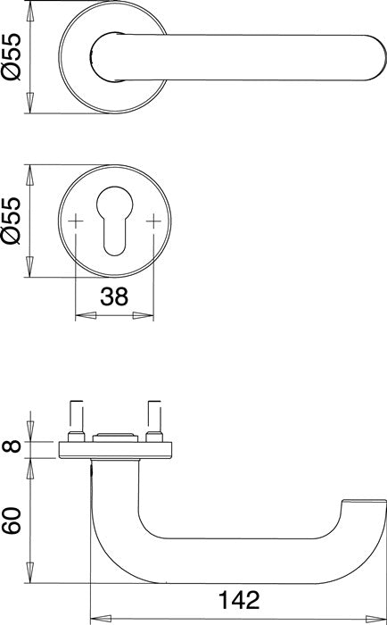 Juego de protección combinado con roseta atornillada · Construcción básica: interior = acero, exterior = fundición inyectada, en la versión con ZA = aluminio macizo · Versión de rosetas interiores: Ø 55 mm, espesor 8 mm · Alojamiento del mango: suelto · Tipo de mango y espesor: 103 con Ø 22 mm · Ejecución del botón: K2 (desplazado) · Leva de soporte: M5, Ø 8 mm · Conexión por tornillo: M5 cuádruple, oculto · Pasador de cambio de rodillo especial con rosca M12 · Clase de resistencia ES1 · Modelo 8722 = escudo exterior con protección contra perforación y tapa cilíndrica: con resorte para proyección de 11 - 14 mm · Distancia 72 mm · DIN izquierda / derecha · Cuadrado 8 mm · Conjunto intercambiable