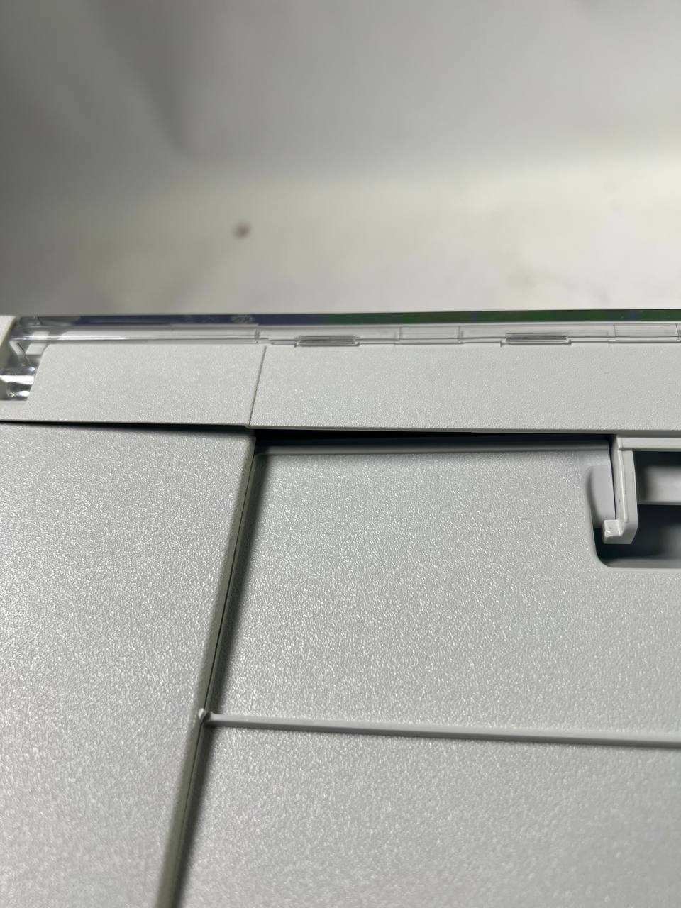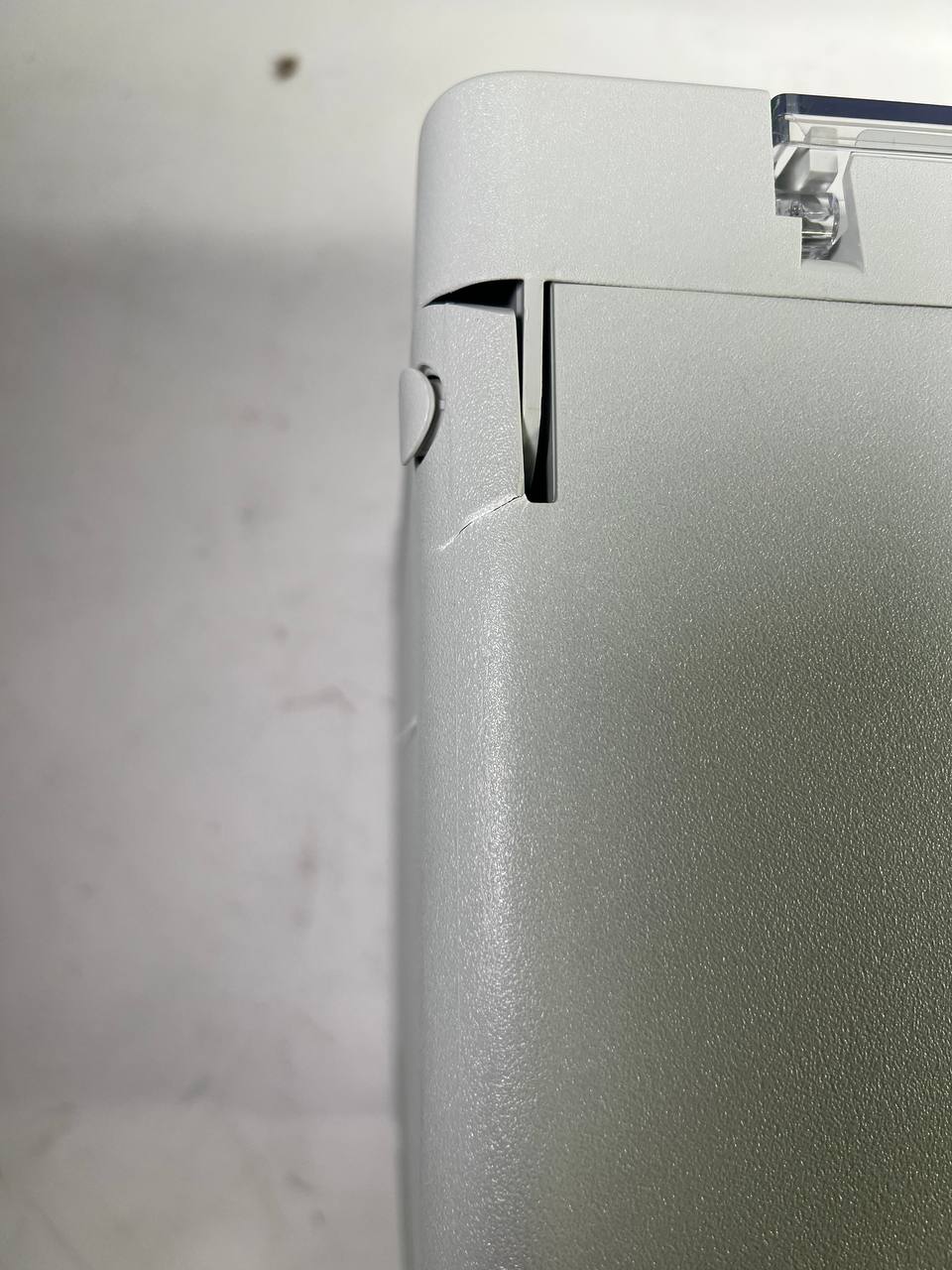 - Beschädigt: Bruch an der Kante + Seite lässt sich eindrücken