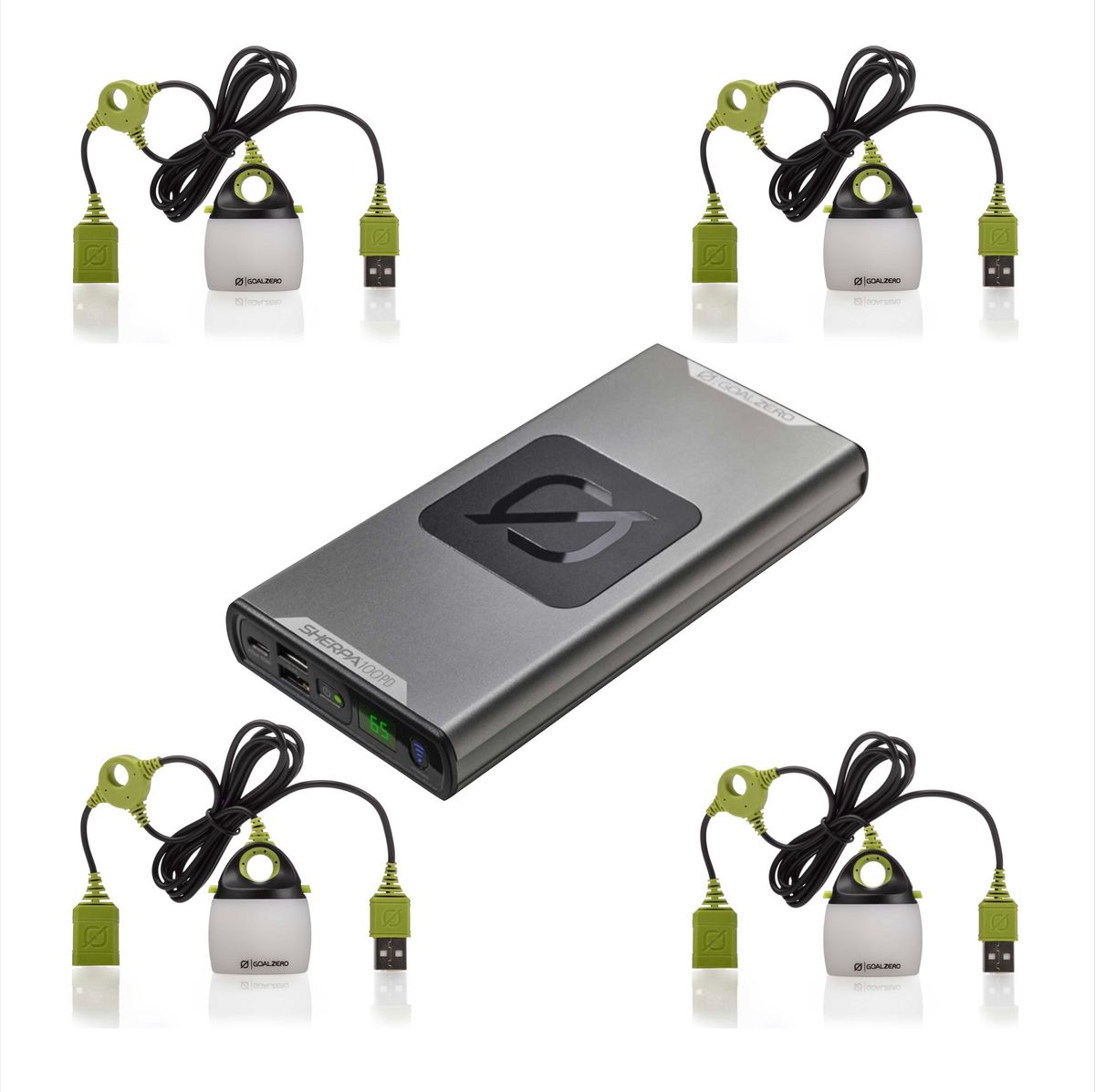 Goal Zero Sherpa 100 PD Power Bank Carga inalámbrica Qi 14,8 V 6,4 Ah + 4x Light a Life Mini USB Luz encadenable 110 lúmenes