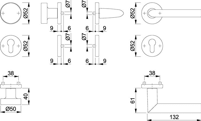 Juego de roseta para puerta interior comprobado según DIN EN 1906 (categoría de uso clase 3) - Manillas con conexión rápida de pasador (con pasador macizo de 8 mm) para grosor de puerta de 37-42 mm y muelle de retorno - Rosetas con levas de soporte atornilladas de forma invisible - Longitud de la manilla para aluminio 132 mm, para acero inoxidable 131 mm - Dirección de tope DIN izquierda / derecha
