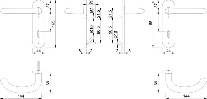 Juego de placa corta para puertas interiores homologado según DIN EN 1906 (categoría de uso clase 3) · Manillas con conexión de pasador rápido (con pasador macizo de 8 mm) para puertas de 37 a 42 mm de grosor y muelle de retorno · Tornillos ocultos · Sentido de apertura DIN izquierda/derecha, distancia 72 mm