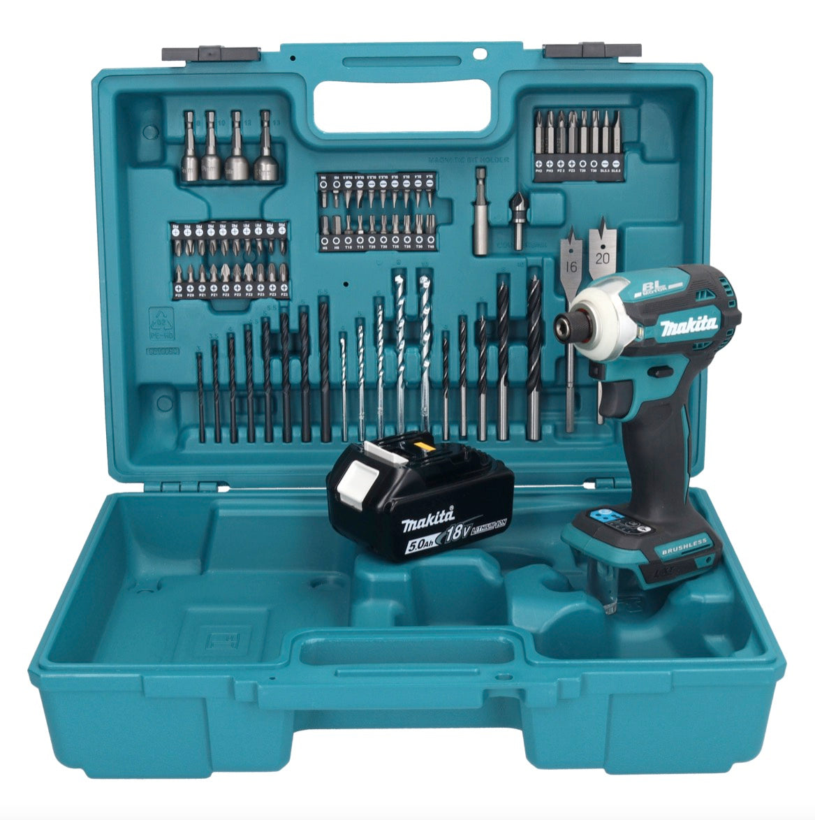 Makita DTD 171 T1X1 llave de impacto a batería 18 V 180 Nm 1/4" sin escobillas + 1x batería 5,0 Ah + set de accesorios 74 piezas + maletín - sin cargador