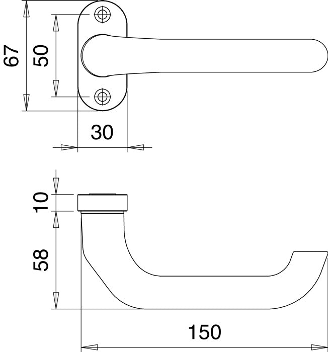 para puertas enmarcadas - acodado, de giro fijo sobre roseta maciza ovalada - roseta: espesor 10 mm - altura 67 mm - anchura 30 mm - distancia entre agujeros para tornillos 50 mm - atornillado visible - DIN izquierda / derecha - suministrado sin pasador ni tornillos