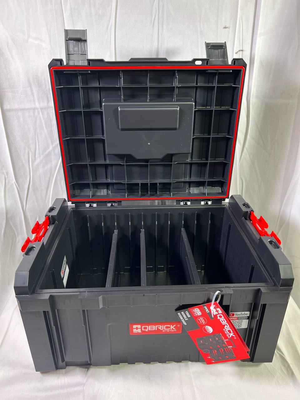 Die Qbrick System PRO Toolbox ist eine geräumige, modulare Werkzeugbox, die bereits standardmäßig eine breite Palette an Zubehör bietet: eine im Deckel integrierte flexible Dichtung, die eine hohe Beständigkeit gegen das Eindringen von Staub und Wasser gewährleistet, 3 verstellbare Fächer, eine geräumige Ablage sowie seitliche Verbindungs- und Befestigungselemente aus super strapazierfähigem Polyamid vorne. Spezielle Führungen in der QS PRO Toolbox ermöglichen es Ihnen, die QS TWO Multi Organizer zu platzieren, die der Aufbewahrung von kleinem Werkstattzubehör dienen.