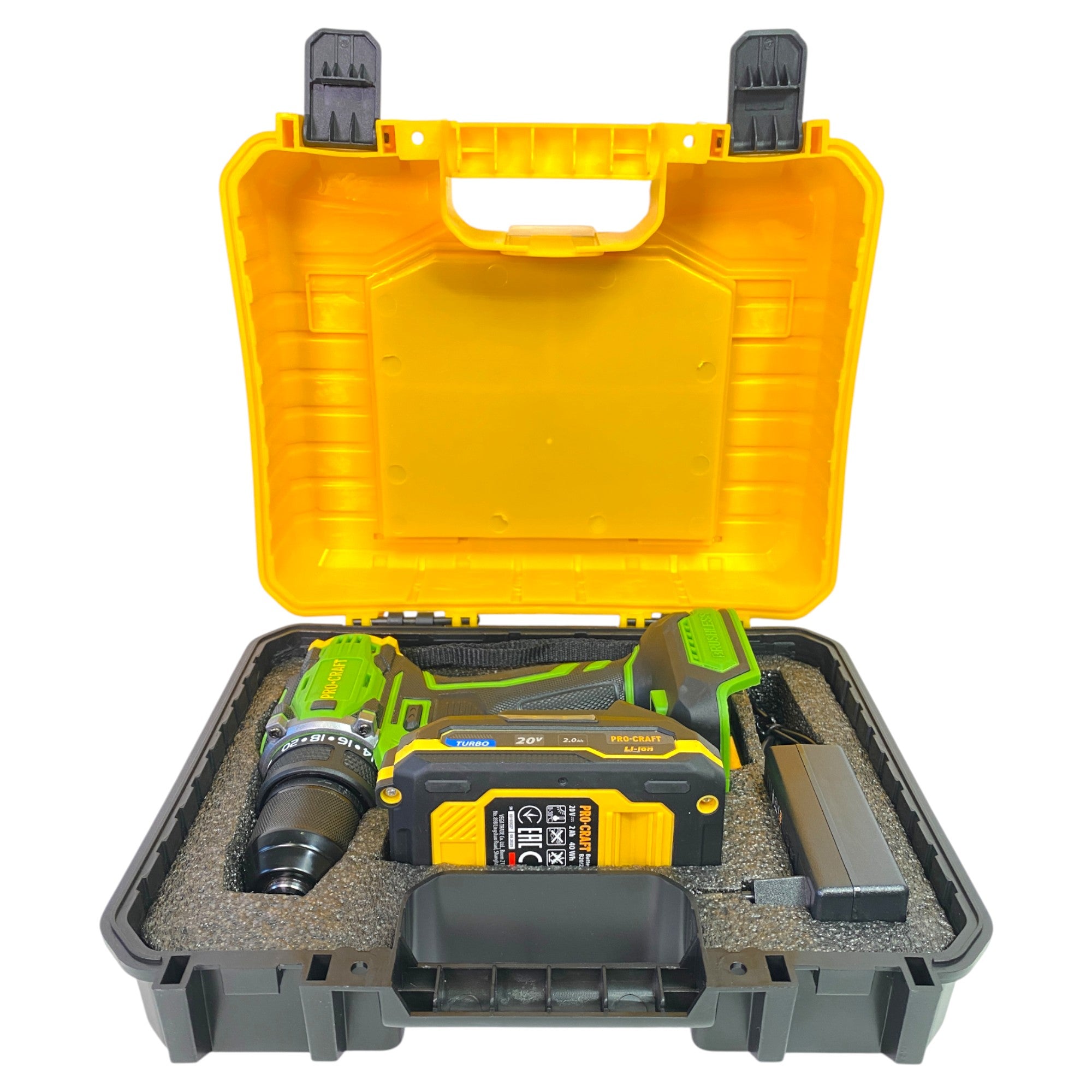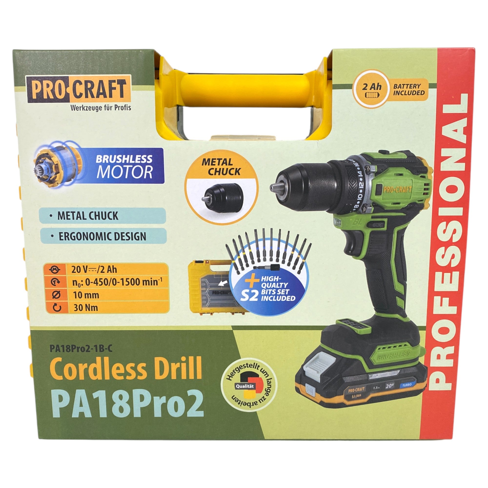 Taladro atornillador a batería Procraft PA18Pro2-1B-C 20 V 30 Nm sin escobillas + 1 batería de 2,0 Ah + cargador + juego de 13 puntas + maletín