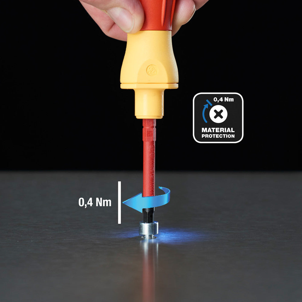 El destornillador proporciona un soporte de tornillo electrónico, lo que libera al usuario del agotador atornillado, pero al mismo tiempo deja al usuario el apriete manual y suave. El speedE® gira el tornillo con hasta 0,4 Nm. Sin embargo, esta fuerza puede aumentarse manualmente hasta 8 Nm y limitarse gradualmente con los adaptadores easyTorque. La nueva tecnología duplica la velocidad de atornillado. Las funciones de protección del material garantizan el control total de la fuerza de apriete a pesar de la alta velocidad de apriete. Además, se ha instalado un potente LED que ilumina suficientemente la zona de trabajo directa. El destornillador ha sido probado por VDE y es adecuado para trabajos de hasta 1.000 voltios. Se pueden realizar sin problemas hasta 800 atornillamientos por carga de batería. El speedE® es especialmente adecuado para tornillos roscados y procesos de atornillado sensibles.