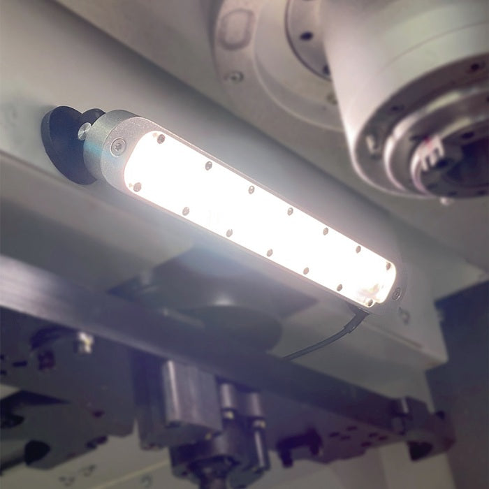 LED haute performance dans un boîtier en aluminium, étanche à l'eau - éclairage uniforme de 120 degrés, sans éblouissement ni scintillement, peu de reflets - connexion à la commande de la machine 24 volts ou avec bloc d'alimentation 24 volts - étanche à l'eau selon IP67 jusqu'au couplage du bloc d'alimentation - "Made in Germany" - installation flexible
