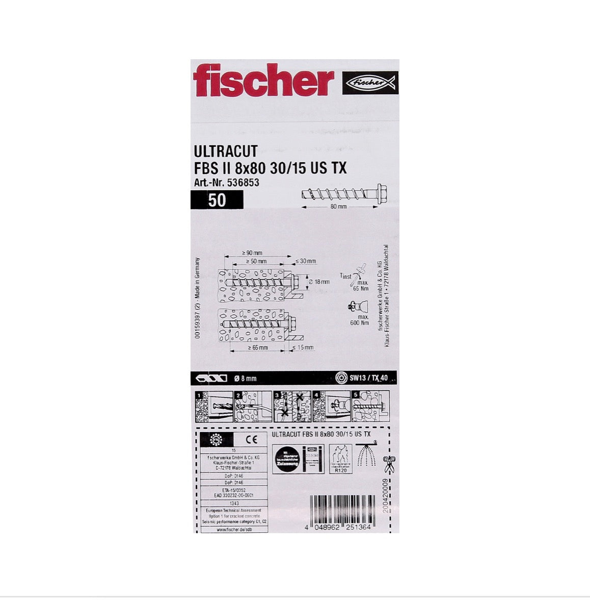 Vis à béton Fischer ULTRACUT FBS II 8x80mm 30/15 100 pièces tête hexagonale SW13 rondelle TX40 galvanisée (536853) + foret à béton en acier SDS-Plus 10x215 (B-58213).
