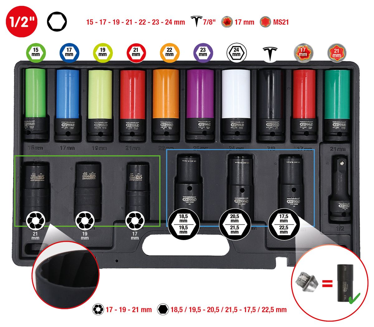 KS TOOLS Jeu de douilles à chocs spéciales MASTER 1/2' pour raccords vissés de roue, 17 pcs ( 515.0885 )