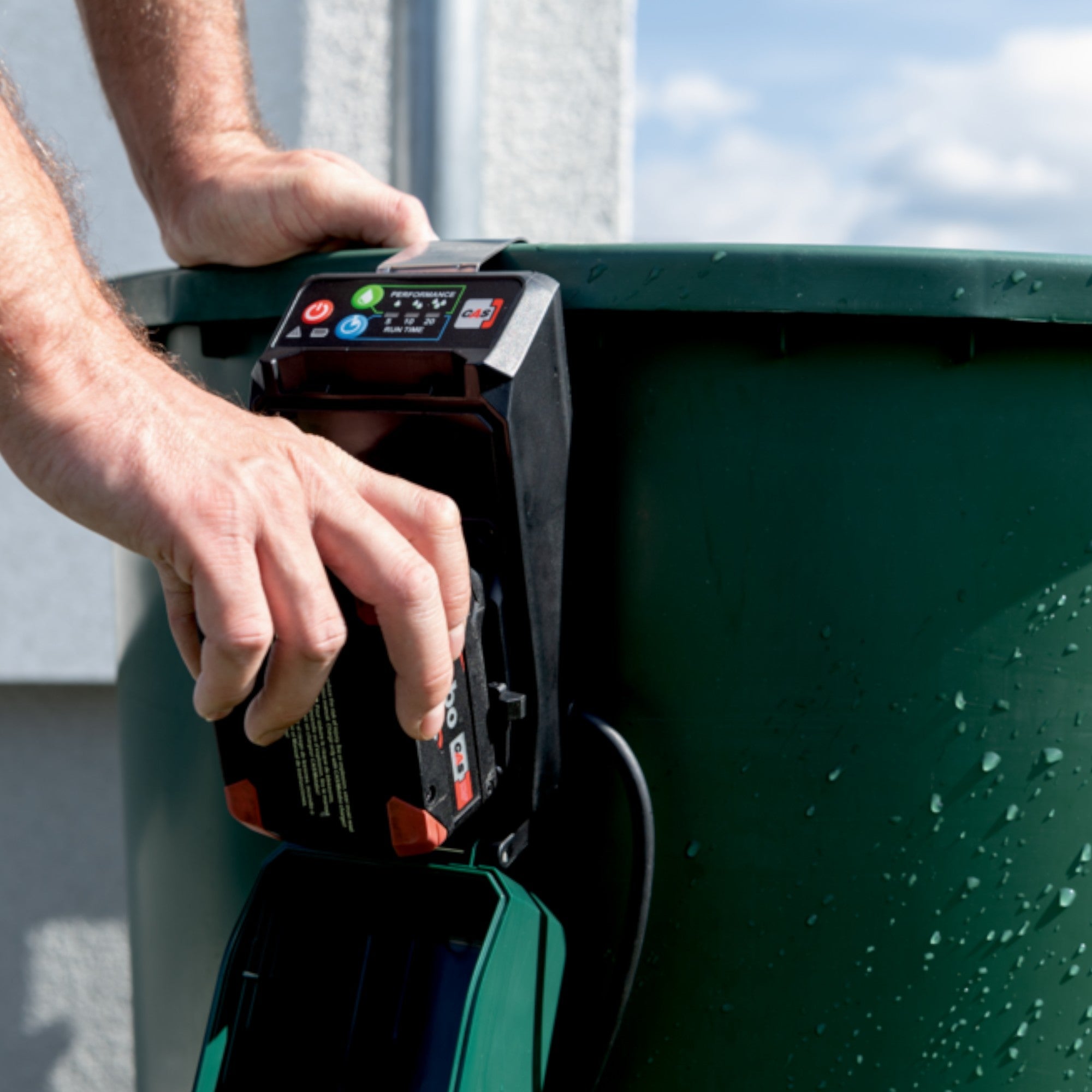 La pompe Metabo TPF 18 LTX 2200 Akku submersible et pour tonneaux de pluie est la solution parfaite pour un pompage d'eau flexible et écologique. Dotée de deux fonctions, elle s'utilise sans effort comme pompe immergée ou comme pompe pour tonneau de pluie, idéale pour l'arrosage durable du jardin avec de l'eau de pluie ou pour le pompage d'eau claire dans des réservoirs, des piscines ou des caves inondées. Grâce au retrait sans outil du pied de la pompe, le passage d'un mode à l'autre se fait rapidement et facilement. La pompe fonctionne en aspiration peu profonde jusqu'à un niveau d'eau résiduelle de seulement 1-2 mm, ce qui la rend particulièrement efficace. Le boîtier de batterie externe protège la batterie de l'humidité et peut être facilement fixé aux murs ou à des récipients, tandis que le panneau de commande clair permet une commande intuitive. La fonction pratique de minuterie permet de régler trois durées de fonctionnement, parfaites pour une utilisation avec des arroseurs de jardin. La pompe offre des possibilités de dosage flexibles de la pression et du débit d'eau grâce à trois niveaux de puissance et une vanne de régulation. Sa forme élancée (Ø 142 mm) et son long câble vers le boîtier d'accumulateurs la rendent adaptée à de nombreux récipients. La Metabo Pump Protection avec protection automatique contre la marche à sec et affichage LED assure une sécurité maximale. Le double système d'étanchéité et la protection contre les surcharges garantissent une longue durée de vie, tandis que le filtre lavable protège la pompe contre les salissures. Un boîtier robuste en plastique résistant aux chocs, un enrouleur de câble intégré et une poignée de transport pratique complètent le design. De plus, la pompe fait partie du Cordless Alliance System (CAS) et est compatible avec tous les packs d'accumulateurs 18V et les chargeurs des marques CAS.
