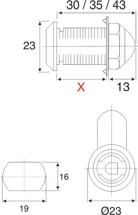avec fixation par écrou - course de fermeture 90º, levier de fermeture 35 mm de long, réversible - Ø de cylindre 18 mm - Zamak nickelé - cylindre monté - 2 clés - épaisseur = X