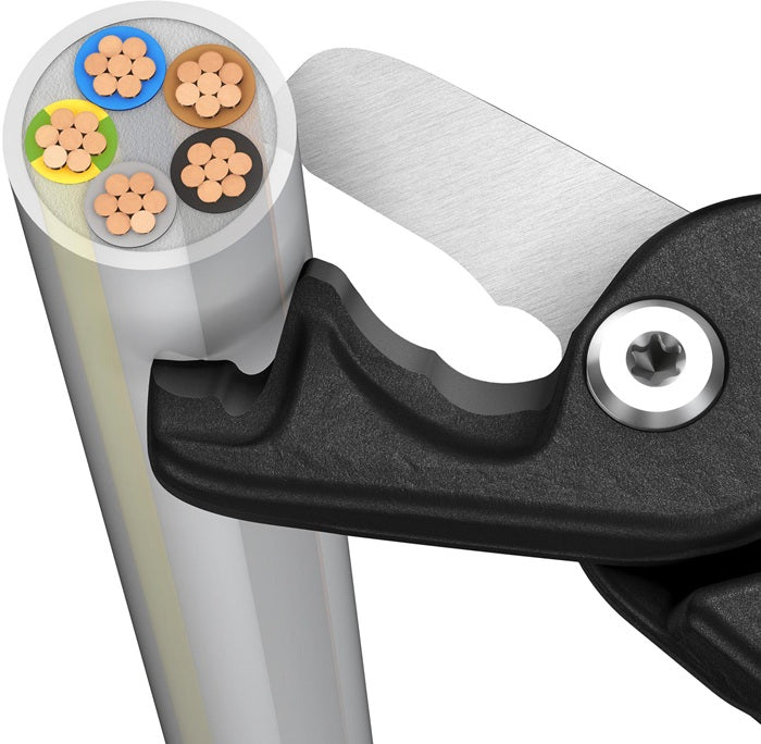 Cesoie per cavi con snodo elettrico, gambe lunghe e bordi di taglio ottimizzati: taglio più semplice fino al 60% rispetto alle cesoie per cavi compatte - enorme capacità: taglia cavi in rame o alluminio massiccio fino a 35 mm², cavi a trefoli fino a 70 mm² e cavi a fili sottili fino a 120 mm² - due aree di taglio: il tagliente principale a gradini mantiene sempre i cavi più piccoli e più grandi il più vicino possibile alla giunzione durante il taglio - il tagliente anteriore viene utilizzato per tagliare gradualmente ("rosicchiare") i cavi molto grandi - comodo utilizzo con una o due mani grazie alla larghezza ridotta delle gambe - giunto di potenza avvitato: alta trasmissione, scorrevolezza, regolabile - testa sottile per una migliore accessibilità - protezione antitrappola per lavorare in sicurezza - non adatto per cavi rinforzati in acciaio come l'ACSR