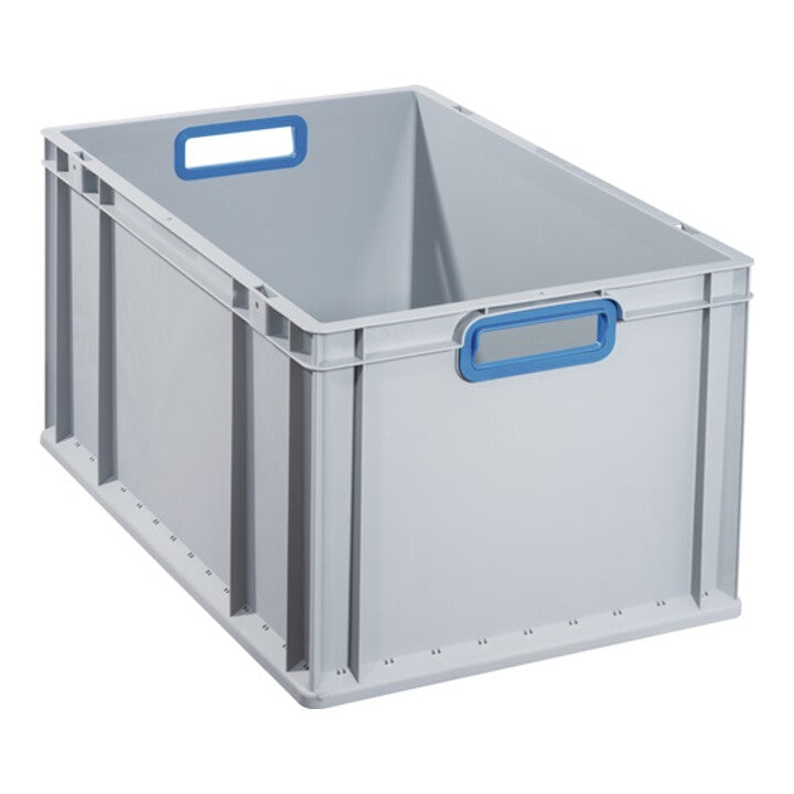 grigio - polipropilene dimensionalmente stabile - pareti rinforzate con nervature - adattato alle dimensioni dei pallet Euro - bordo autocentrante e impilabile a tutto tondo - pulizia ottimale grazie alle pareti interne lisce - resistente alla maggior parte degli acidi e degli oli - resistente alle temperature da -10 °C a +60 °C - pareti chiuse - maniglia blu, aperta