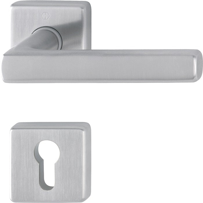 Set di rosette per porte interne testato secondo DIN EN 1906 (categoria d'uso 3) - Maniglie con attacco rapido a perno (quadro 8 mm) per porte di spessore 37-42 mm e molla di ritorno - Rosette con camme di supporto avvitate in modo invisibile - Acciaio inox opaco - Direzione cerniera DIN sinistra/destra