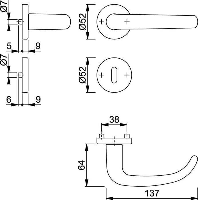 Rosone per porte interne secondo DIN EN 1906 (categoria d'uso 3) - Maniglie con attacco rapido (con perno pieno da 8 mm) per porte di spessore 37 - 42 mm - Rosone con sottostruttura in plastica, molla di richiamo e camme di supporto - Fissaggio nascosto, continuo - Lati alternati incl. viti multiuso - Direzione di battuta DIN sinistra / destra