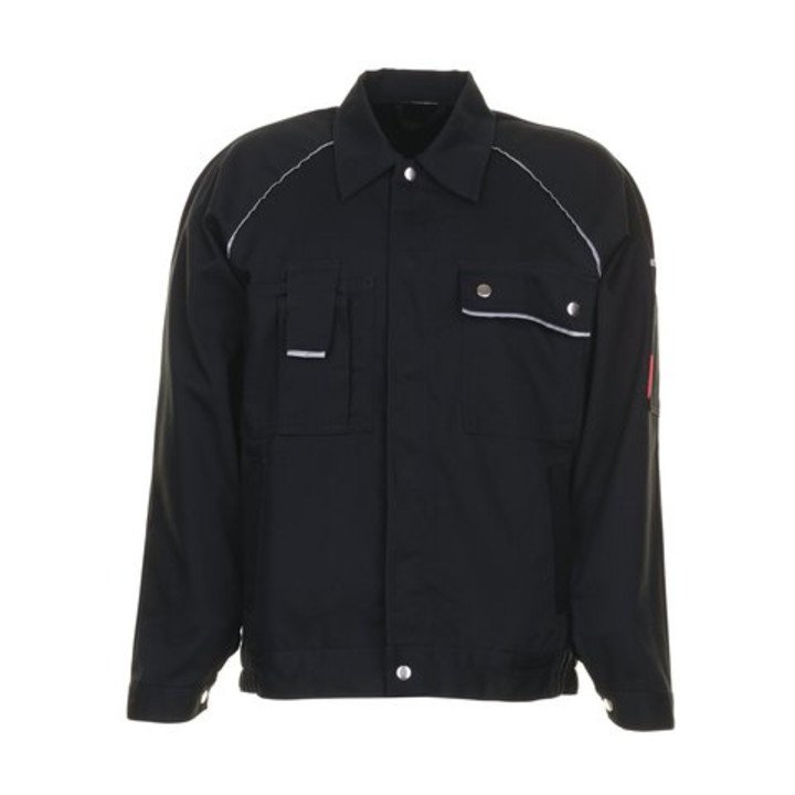 65% poliestere / 35% cotone - armatura a tela - ca. 320 g/m² - tessuto posteriore molto traspirante, particolarmente resistente, resistente al restringimento secondo DIN EN ISO 6330 - 2 tasche interne a marsupio in Cordura® - piping riflettente sull'inserto della manica e sulle patte delle tasche - 2 tasche sul petto, a sinistra con patta e bottoni a pressione, a destra con tasca aggiuntiva per il cellulare - tasca sulla manica a sinistra con doppio taschino per la penna - elastico in vita - abbottonatura con bottoni a pressione nascosti come chiusura anteriore - polsini delle maniche regolabili con bottoni a pressione disponibili su richiesta taglie: 42-64, 90-110 e 24-27