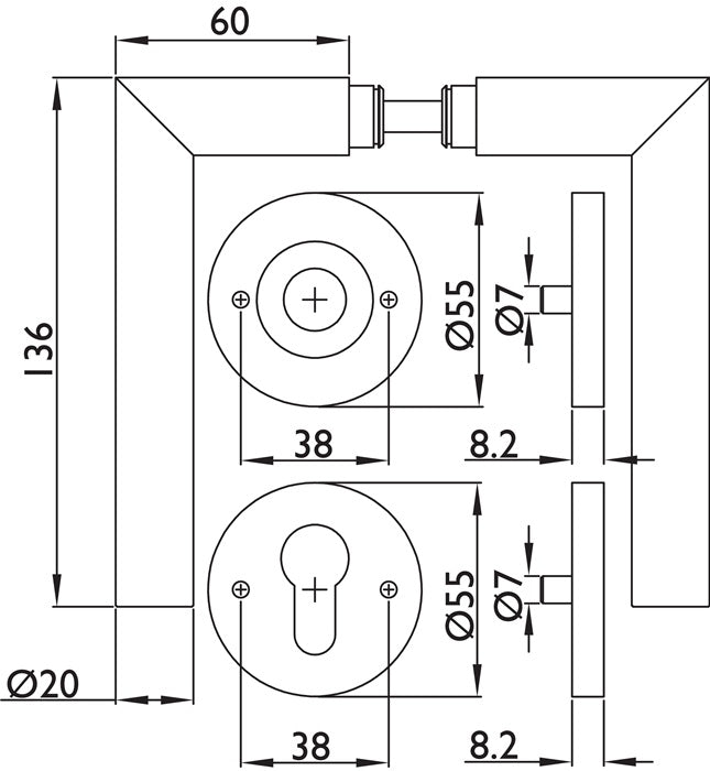 incl. materiale di fissaggio, adatto allo spessore della porta: PZ / PZW = 40-58 mm, con molla di ritorno - mandrino quadro da 9 mm Non adatto alle porte per uscite di emergenza!
