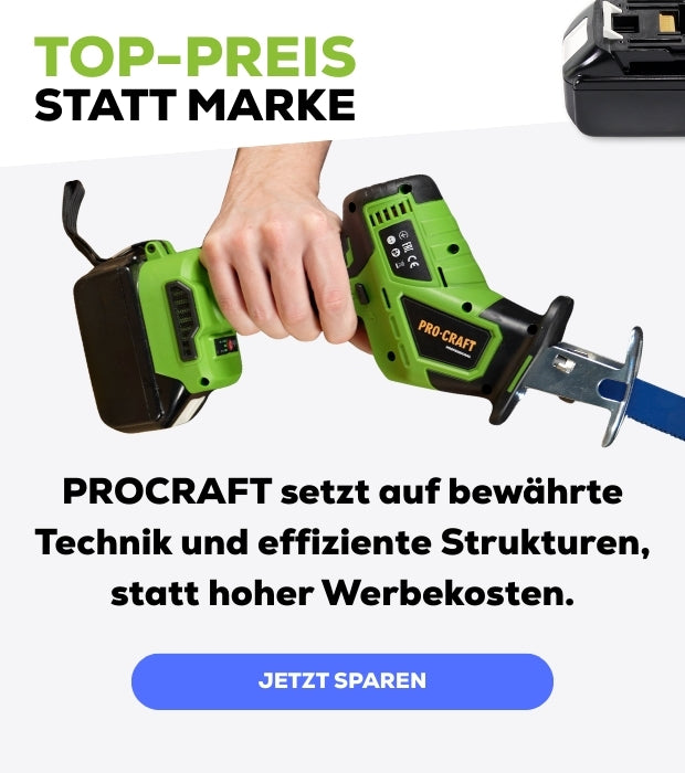 Weil PROCRAFT als System gedacht ist. Du behältst dein bestehendes Akku-System und ergänzt nur das Werkzeug. So entfallen zusätzliche Kosten für Akkus, Ladegeräte und Marketing-Aufschläge – ohne Kompromisse bei Material oder Verarbeitung.