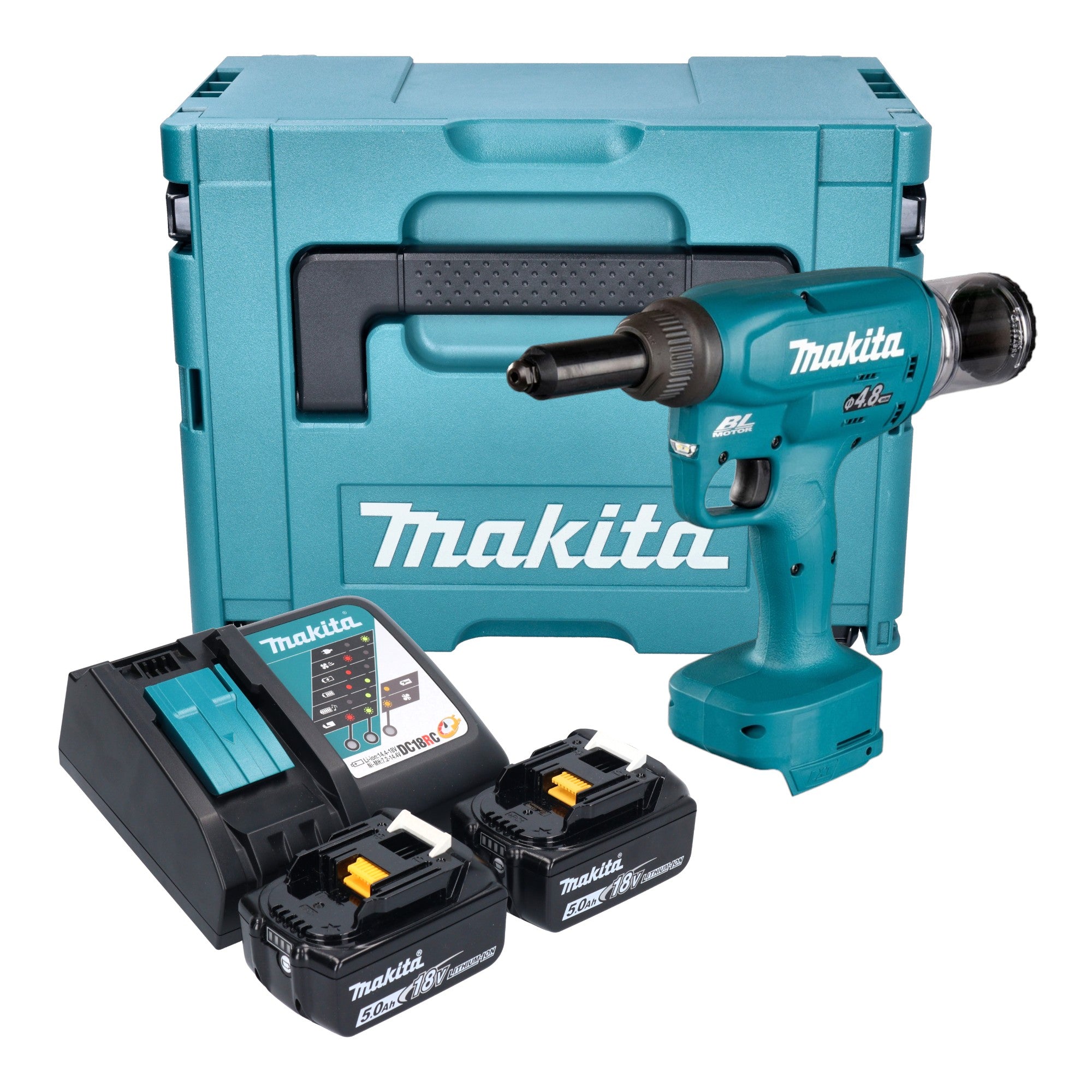 Akumulatorowa nitownica Makita DRV 150 RTJ 18 V 10 kN 2,4 - 4,8 mm bezszczotkowa + 2x akumulator 5,0 Ah + ładowarka + Makpac
