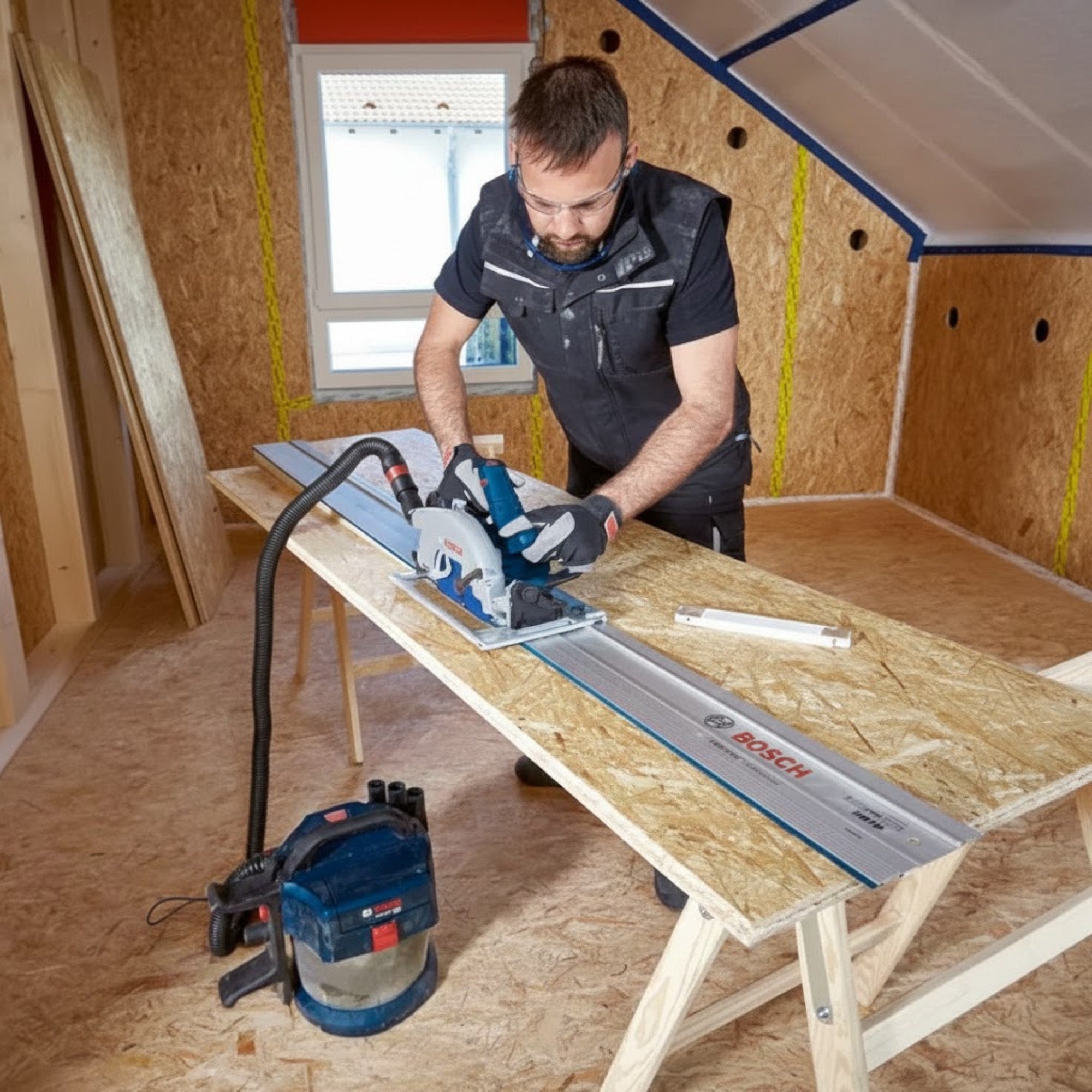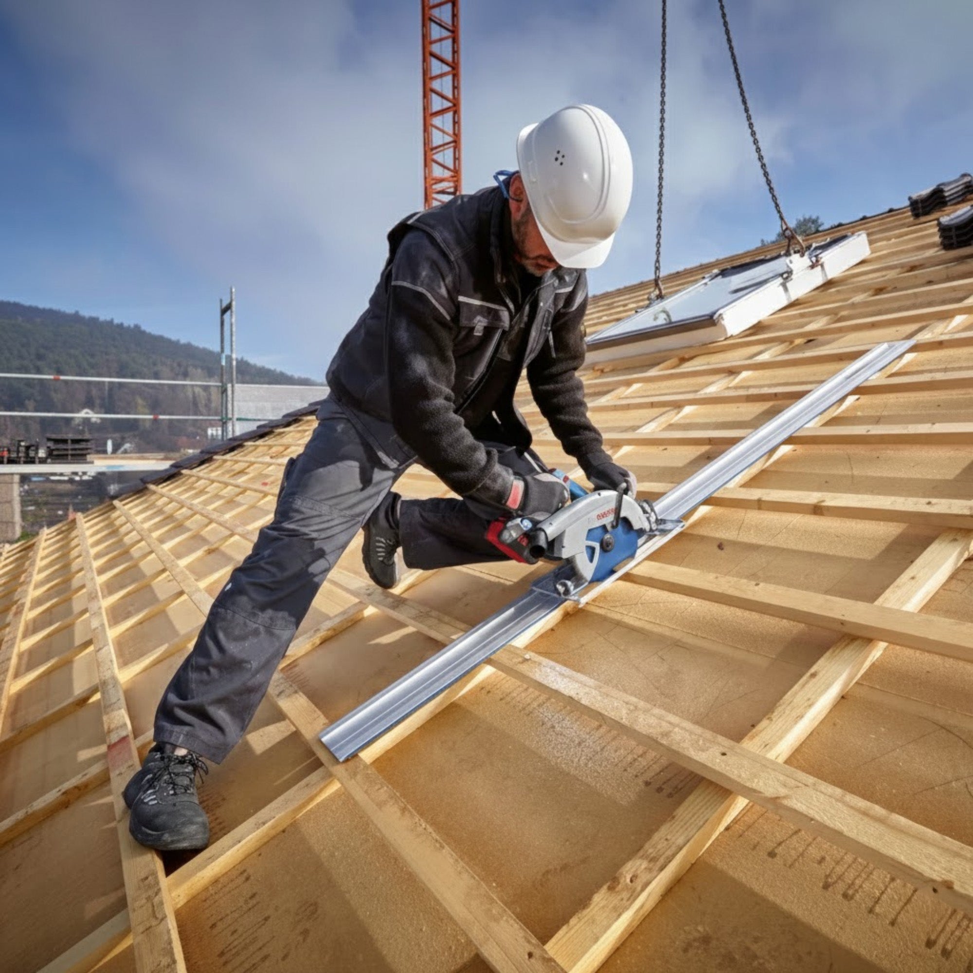 Die Bosch Professional GKS 18V-68 G ist eine leistungsstarke Akku-Handkreissäge mit bürstenlosem Motor, die laut Bosch eine kabellose Schnittleistung auf dem Niveau einer kabelgebundenen 1.800-W-Säge liefert, bei voller Bewegungsfreiheit auf der Baustelle. Für präzises Arbeiten setzt Bosch auf eine komfortable, intuitive Tiefenverstellung und ein neues Zusatzgriff-Konzept, das eine sehr gute Kontrolle in unterschiedlichen Schnittpositionen unterstützt. Für den professionellen Einsatz ist die Säge auf effizientes und sicheres Arbeiten ausgelegt: Mit User Interface zur individuellen Drehzahleinstellung, Schnellbremse, ECO-Modus (laut Bosch bis zu 30 % längere Laufzeit), Überlast- und Wiederanlaufschutz, Spindelarretierung sowie einem 360° drehbaren, integrierten Absaugstutzen. Sie ist für Holz und Holzverbundstoffe gedacht und kann mit dem Bosch Click & Clean System, Staubbeuteln sowie FSN-Führungsschienen genutzt werden. Laut Angaben des Herstellers passt sie außerdem auf Führungsschienen von Festool, Makita und Mafell.