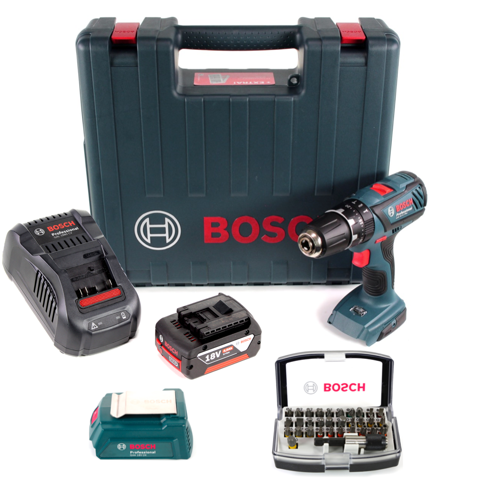 Bosch GSB 18-2-Li Plus Schlagbohrschrauber Professional 18 V im Koffer + 1x GBA 6,0 Ah Akku + Bosch GAL 1880 CV Schnellladegerät + Bosch 32 teiliges Bit Set + Bosch USB Ladegerät Adapter für 18V Akkus