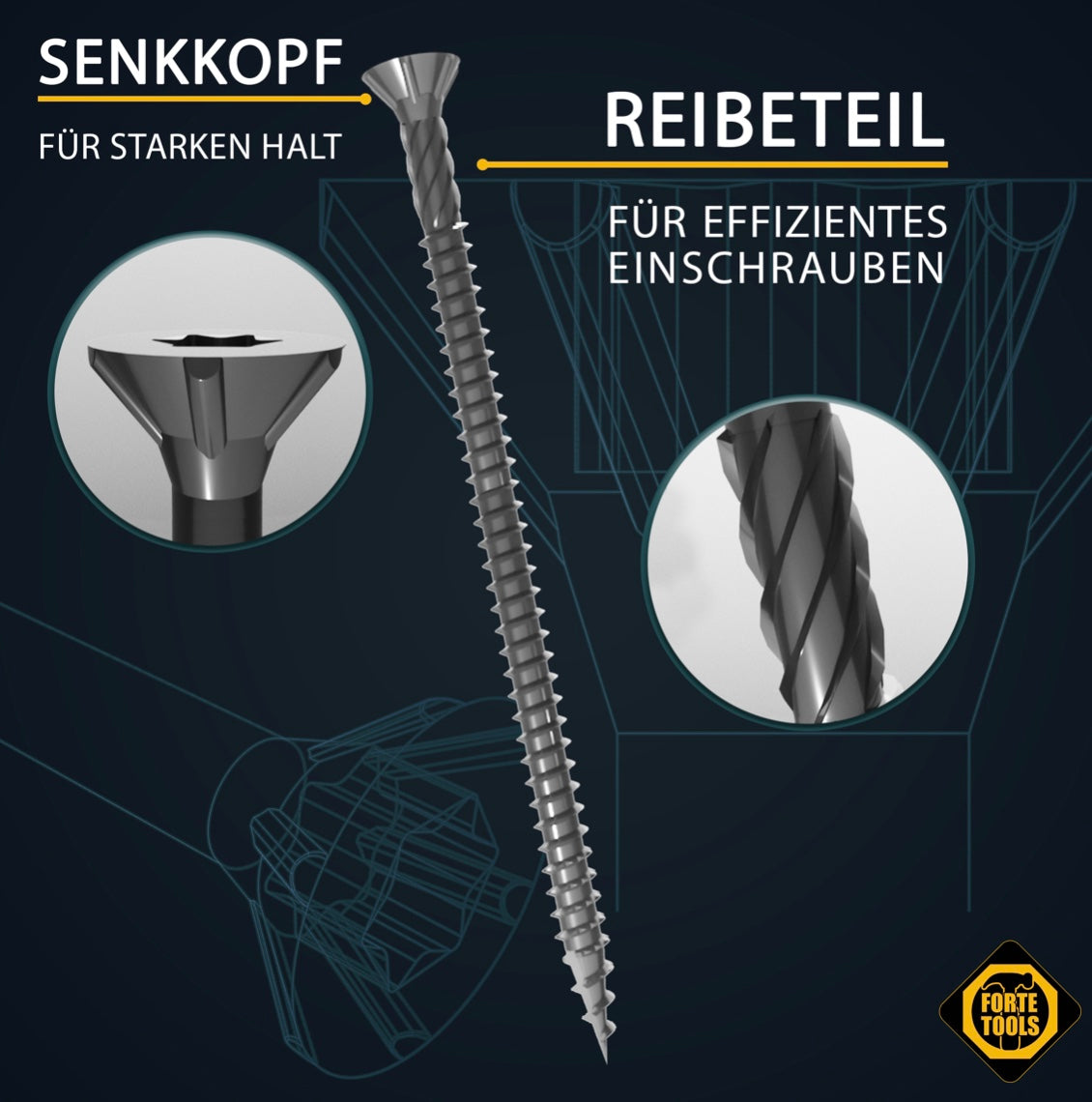 Die FORTE Tools Holzschraube mit Torx Aufnahme garantiert dem Anwender eine hohe Flexibilität durch universelle Einsetzbarkeit in unterschiedlichen Materialien wie Holz, Kunststoff oder Metallblech. Der Senkkopf sorgt für eine saubere und bündige Versenkung der Schraube in Holz. Die Torx Aufnahme erlaubt eine bessere Kraftübertragung auf die Schraube, höhere Standzeiten sowie ein schnelleres Einfädeln der Schraube mit zugleich besserem Passsitz am Werkstück. Zusätzlich sorgt das Wellenprofil am vorderen Gewinde für ein leichtes und sicheres Verschrauben. Die Verzinkung sorgt für einen Korrosionsschutz und eine deutlich höhere Oberflächenhärte als herkömmliche blanke Schrauben, wodurch sich die Einsatzmöglichkeiten um ein vielfaches im Außenbereich erweitern lassen.
