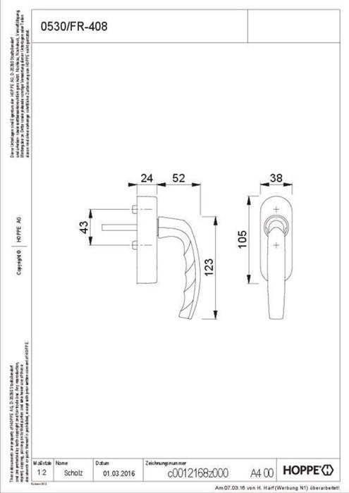 • 1x HOPPE Fenstergriff Atlanta 0530/FR-408 Aluminium F9 / stahlfarben