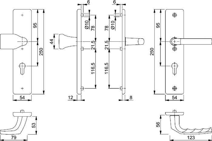 Zestaw wymienny do drzwi końcowych - podkonstrukcja Zamak w płycie zewnętrznej i wewnętrznej - ze stałym pokrętłem - połączenie trzpieniem profilowym - widoczne mocowanie śrubowe - perforacja PZ - wysokość krawędzi płyty zewnętrznej 12 mm - aluminium - wysokość krawędzi płyty: 12 mm - zestaw wymienny - DIN lewy / prawy - klasa odporności ES 0