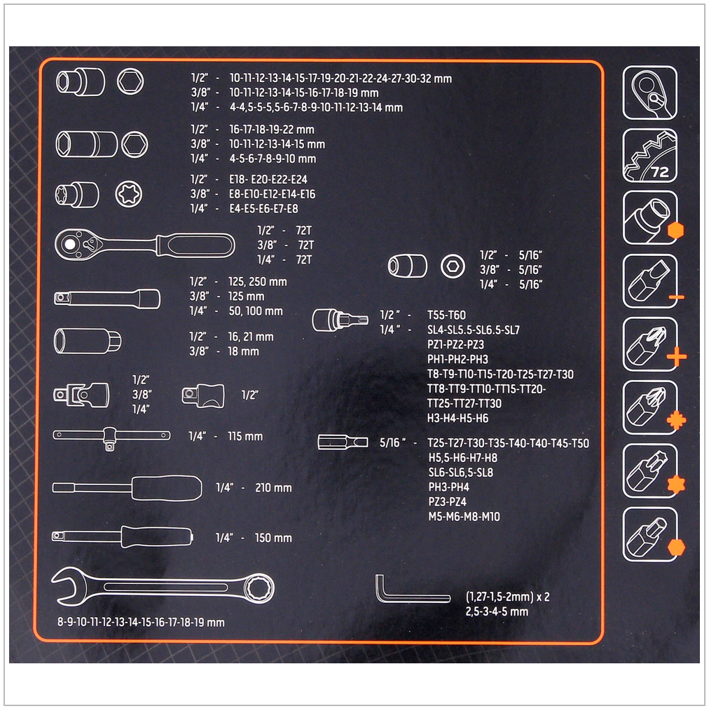 Das Neo Tools 219 PCS Steckschlüssel-Set überzeugt mit seiner großen Auswahl von 219 Teilen aus hochwertigem Chrom-Vanadium-Stahl, beinhaltet 1/2“, 3/8“ und 1/4“ Ratschen mit langlebigem Ratschenmechanismus, mit 72 Zähnen. Optimaler Arbeitskomfort wird mit den ergonomischen Griffen gewährleistet. Das Set verfügt über eine große Auswahl an Innensechskant-Nussköpfen (4 - 32 mm), Torx Bit-Köpfen (E4 - E24), Schrauber-Bits (schlitz, kreuz, sechskant und Torx), Ring-Maulschlüssel (12 Stück, 8 - 19 mm), Bithalter, 1/4“ Schraubendreher-Bithalter. Des Weiteren verfügt das Set über eine weite Palette an ergänzendem Zubehör und ermöglicht durch die vertikale Anordnung eine schnelle und bequeme Entnahme der Teile. Das Set wird in einem passenden und stabilen Kunststoff-Koffer geliefert und erfüllt die Anforderungen Fachleuten. Der Hersteller gewährt 25 Jahre Garantie.