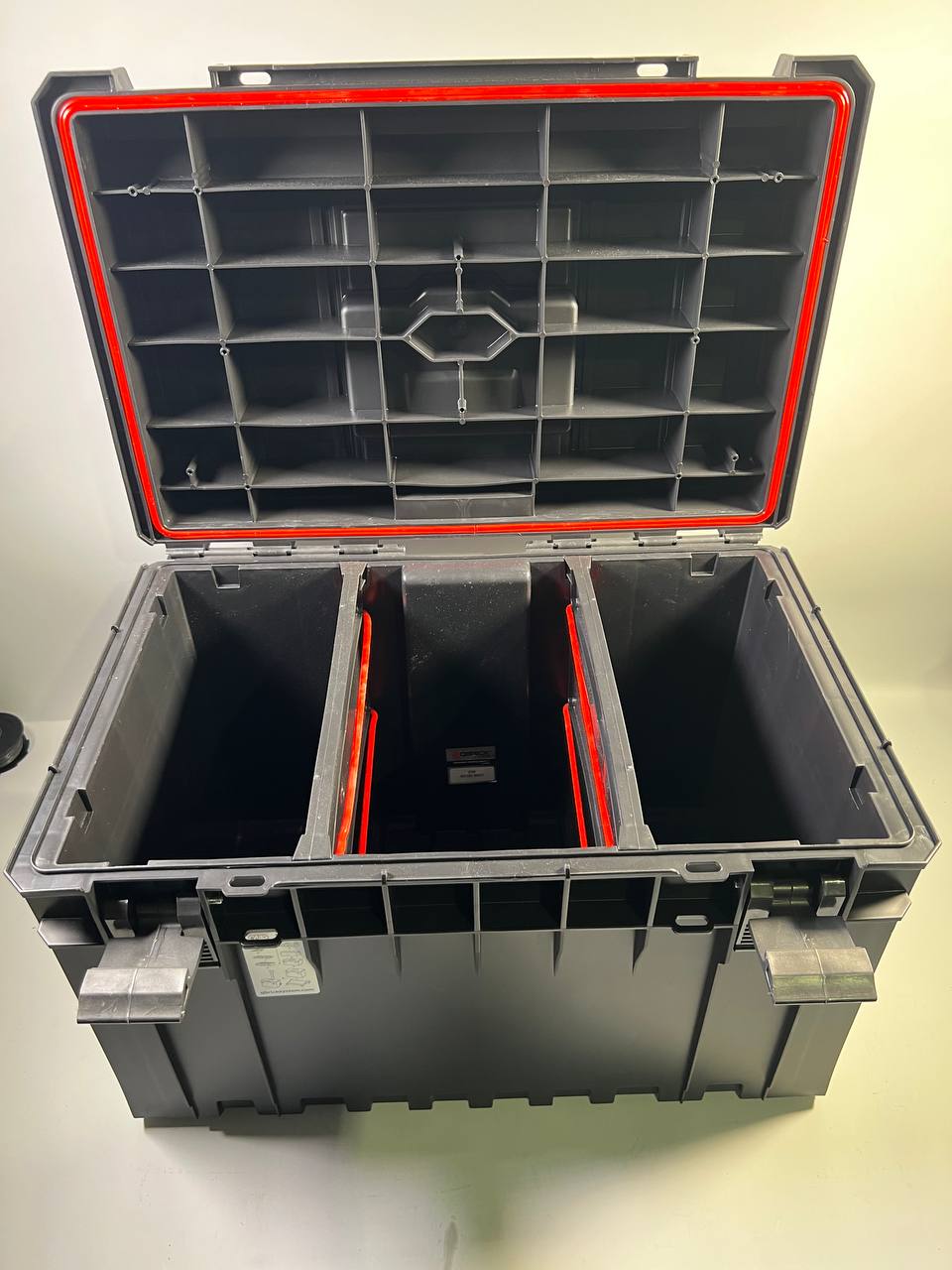 Walizka narzędziowa Qbrick System ONE 450 2.0 Basic o imponującej pojemności 52 litrów oferuje wystarczająco dużo miejsca na duże elektronarzędzia i narzędzia ręczne. Wewnątrz dwie regulowane przegrody zapewniają optymalną organizację i przejrzystość. Dzięki elastycznemu uszczelnieniu walizka jest w pełni chroniona przed wnikaniem pyłu i wody zgodnie z normą IP66, co czyni ją idealną do użytku w wymagających środowiskach pracy. Pokrywa Basic posiada funkcjonalne, niestandardowe wycięcie, które oferuje dodatkowe możliwości zastosowania. Wzmocniona konstrukcja pokrywy i korpusu zapewnia wysoką nośność do 50 kg i może wytrzymać nacisk 120 kg, dzięki czemu obudowa może być również używana jako solidna platforma robocza. Wersja 2.0 linii produktów ONE charakteryzuje się jeszcze bardziej stabilną konstrukcją i oferuje elastyczne opcje rozbudowy dzięki adaptacji do wkładek gwintowanych M8, aby spełnić indywidualne potrzeby użytkownika.