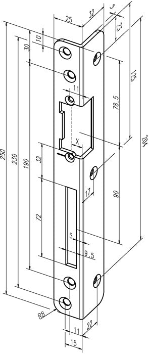mit Fallen- und Riegelausschnitt · Meterrissmarkierung · 3 mm Materialdicke · mit zusätzlicher Befestigungsbohrung · für gängige eff-eff-Standard-Türöffnermodelle außer ProFix®-Varianten