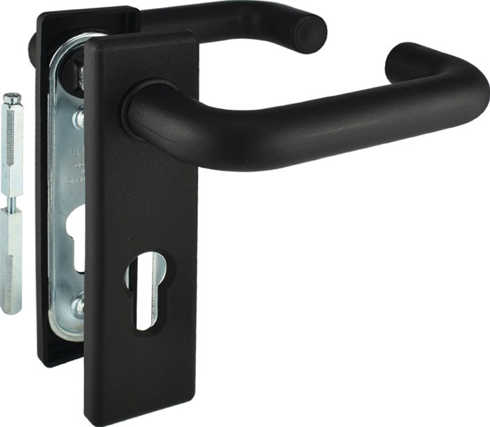 geprüft nach DIN 18273 · mit 2 Befestigungsschrauben · Lochung PZ · Entfernung 72 mm · Vierkant 9 mm · Drücker fest/drehbar gelagert · Schilder mit Stahl-Unterplatten und Kunststoffblenden · käntig· für Türstärke 40-66 mm · DIN links / rechts verwendbar · Farbe schwarz
